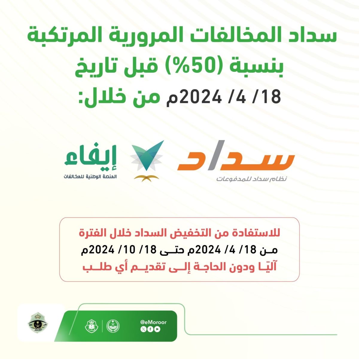 وذلك متاح خلال الفترة الممتدة من 18 أبريل 2024 حتى 18 أكتوبر 2024، مع فرصة الحصول على تخفيض يصل إلى النصف على قيمة المخالفات.