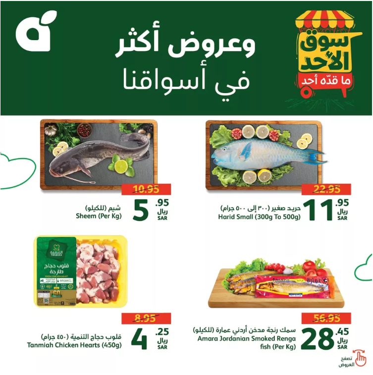 تشمل هذه العروض قلوب الدجاج الطازجة من علامة التنمية، بالإضافة إلى خصومات على أسعار سمك الرنجة المدخن الأردني من عمارة، سمك الحريد الصغير، وسمك الشيم.