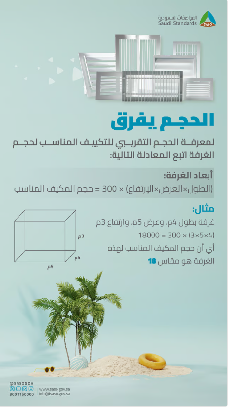 وفي بيان مصور، أوضحت الهيئة أنه يمكن معرفة الحجم التقريبي للمكيف الملائم باستخدام معادلة بسيطة تعتمد على أبعاد الغرفة، حيث يتم ضرب الطول في العرض في الارتفاع في 300 للحصول على الحجم المناسب للمكيف.