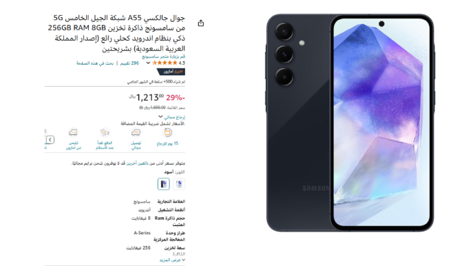 إذا كنت تبحث عن هاتف بتقنيات حديثة وسعر رائع، فإليك عرض لا يفوت على هاتف Samsung Galaxy A55 5G ضمن العروض الأسبوعية لأمازون السعودية! يأتي الهاتف بمواصفات عالية وسعر مخفض، حيث أصبح بإمكانك الحصول على النسخة بسعة تخزين 256 جيجابايت وذاكرة عشوائية 8 جيجابايت بخصم مذهل يصل إلى 29%.