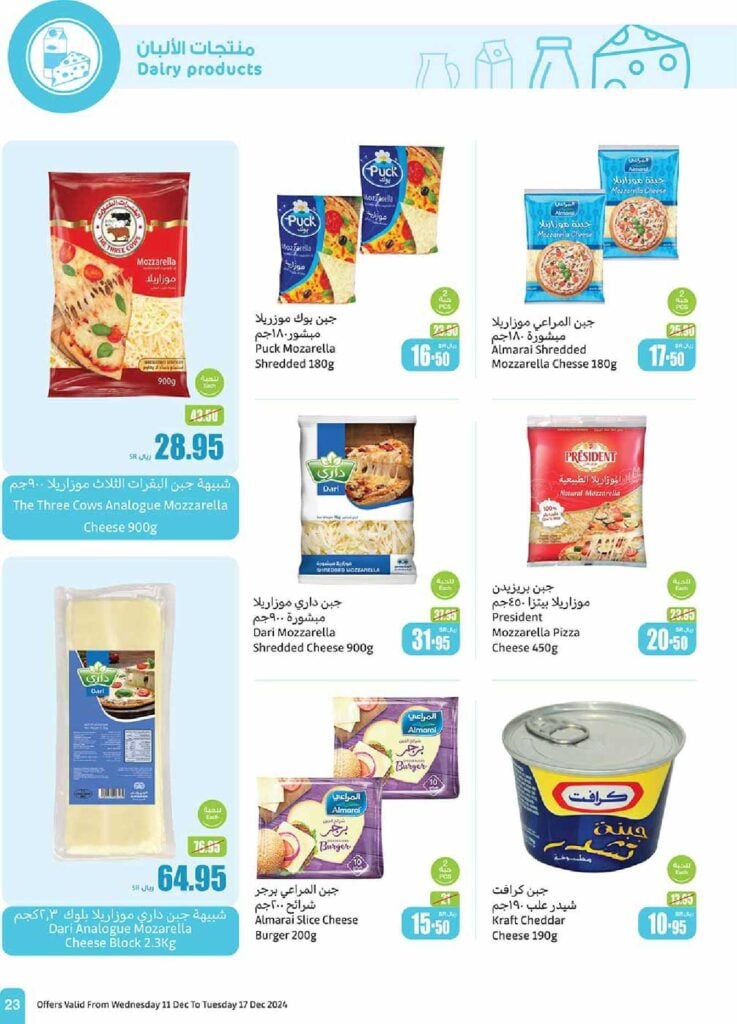 - جبن بوك موزاريلا مبشورة بوزن 180 جرام (عبوتين) بسعر 16.50 ريال سعودي بدلًا من 23.90 ريال سعودي.