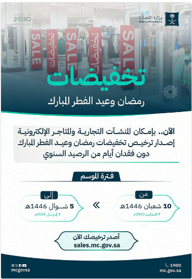 تزامنا مع اقتراب شهر رمضان المبارك وعيد الفطر لعام 1446هـ، أعلنت وزارة التجارة في المملكة العربية السعودية رسميًا عن انطلاق موسم التخفيضات الموسمية الذي سيبدأ اعتبار من يوم 10 شعبان 1446هـ الموافق 9 فبراير 2025م، ويستمر حتى 5 شوال 1446هـ الموافق 3 أبريل 2025م.