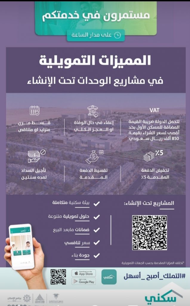 - مبادرة تحمل ضريبة القيمة المضافة: تتحمل الدولة ضريبة القيمة المضافة على المسكن الأول بحد أقصى 850 ألف ريال سعودي.