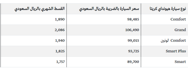 عروض تقسيط هيونداي كريتا في السعودية إن سيارة هيونداي كريتا تعتبر من أشهر السيارات التي زاد الإقبال عليها من قبل محبي السيارات، والجدير بالذكر أن أهم عروض تقسيط هيونداي كريتا في السعودية تأتي على النحو التالي: