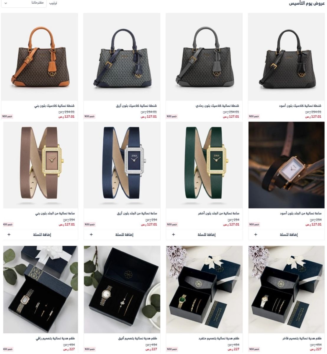 في متجر زايروس، تجد عروض مذهلة على العطور والإكسسوارات، مثل عطر نسائي بسعر 90 ريال بدلًا من 120 ريال وساعة رجالية باللون الأسود بسعر 127.01 ريال بدلًا من 254 ريال.