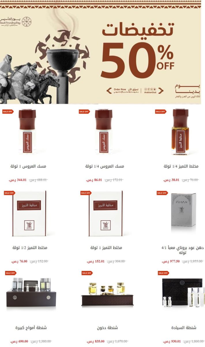 استمتعوا بفرص مميزة خلال عروض "يوم التأسيس" لعام 2024، حيث تقدم لكم "العربية للعود" في المملكة فرصة الحصول على عطوركم المفضلة بنصف السعر العادي.
