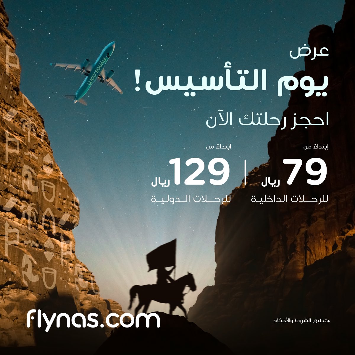 بدأت عروض يوم التأسيس لشركة الطيران ناس، حيث تبدأ الأسعار من 79 ريال للرحلات داخل المملكة، وتبدأ من 129 ريال للرحلات الدولية، يمكنك الحجز من يوم الإثنين الموافق 19 فبراير 2024 حتى يوم الخميس الموافق 22 فبراير 2024، وتشمل فترة السفر من 1 مارس 2024 إلى 31 مايو 2024.