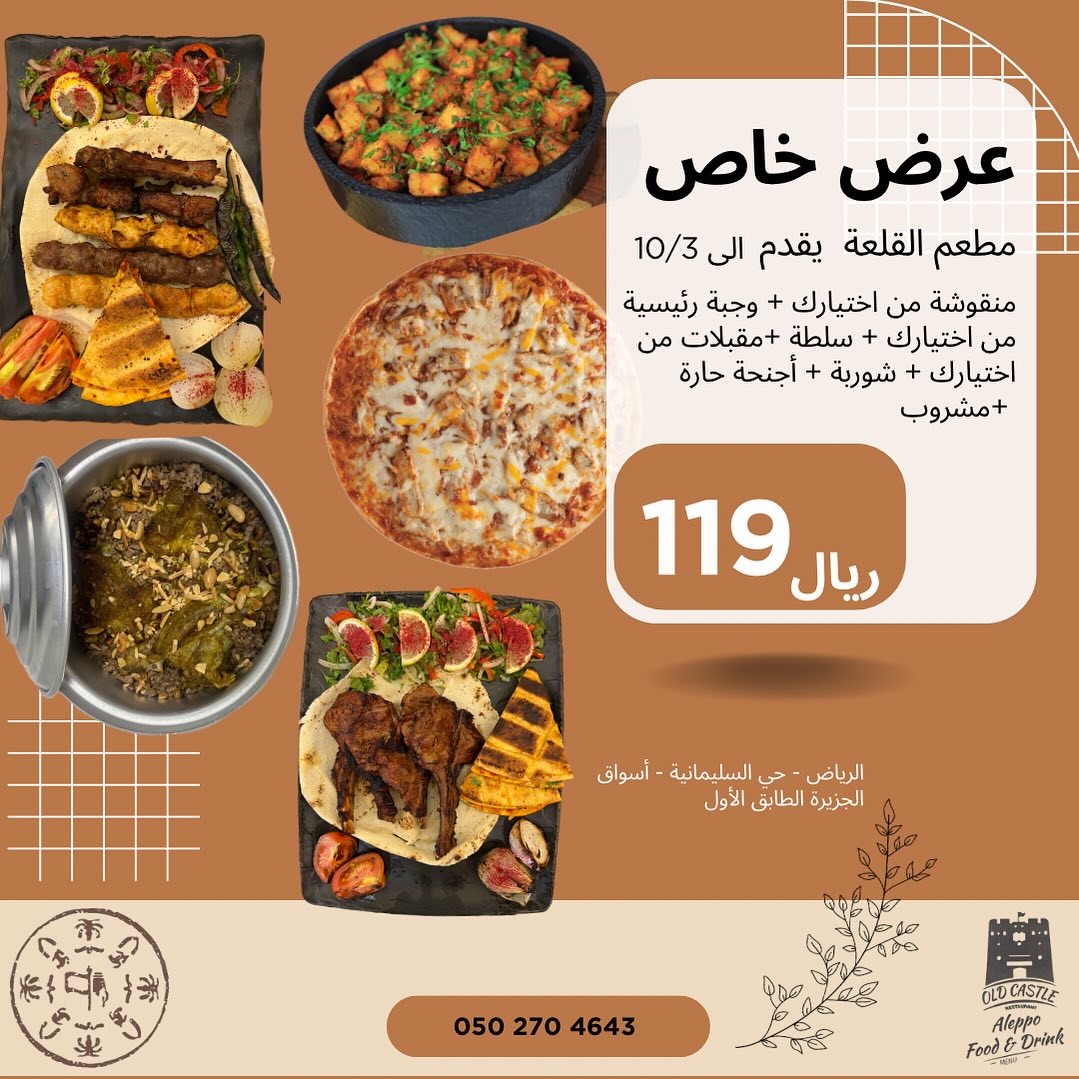 مطعم القلعة: يقدم عروضًا خاصة تشمل تجربة تناول وجبات شهية ومتنوعة تتضمن منقوشة ووجبة رئيسية وسلطة ومقبلات وشوربة وأجنحة حارة، ويُعتبر هذا العرض متاحًا بفرع الرياض حي السليمانية وأسواق الجزيرة.