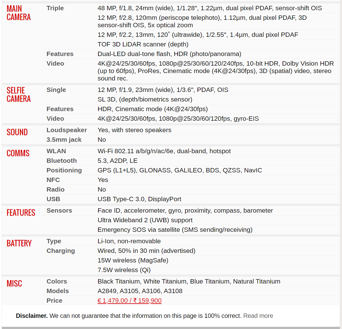 - ملاحظة: وردت تقارير عن تباين أسعار الهاتف بناء على لونه، حيث يعد لون "Natural Titanium" الأغلى، بينما "Blue Titanium" هو الأرخص، رغم ذلك، يظل السعر ثابت في وكلاء أبل، كما أفاد بعض المشترين بإمكانية الحصول على النسخة 256 جيجا بسعر يتراوح بين 4600 و4700 درهم إماراتي خلال التخفيضات بمتاجر مثل كارفور.