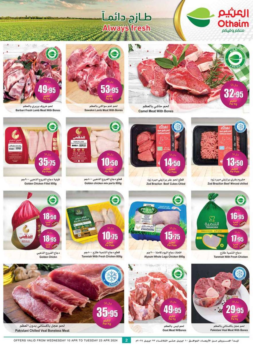 - فيما يتعلق بالعروض على المبردات والمنتجات الطازجة، تقدم العثيم فيليه صدور دجاج الفروج الذهبي الطازج، حيث يبلغ وزن الطبق 900 جرام ويباع بسعر 35.75 ريال.