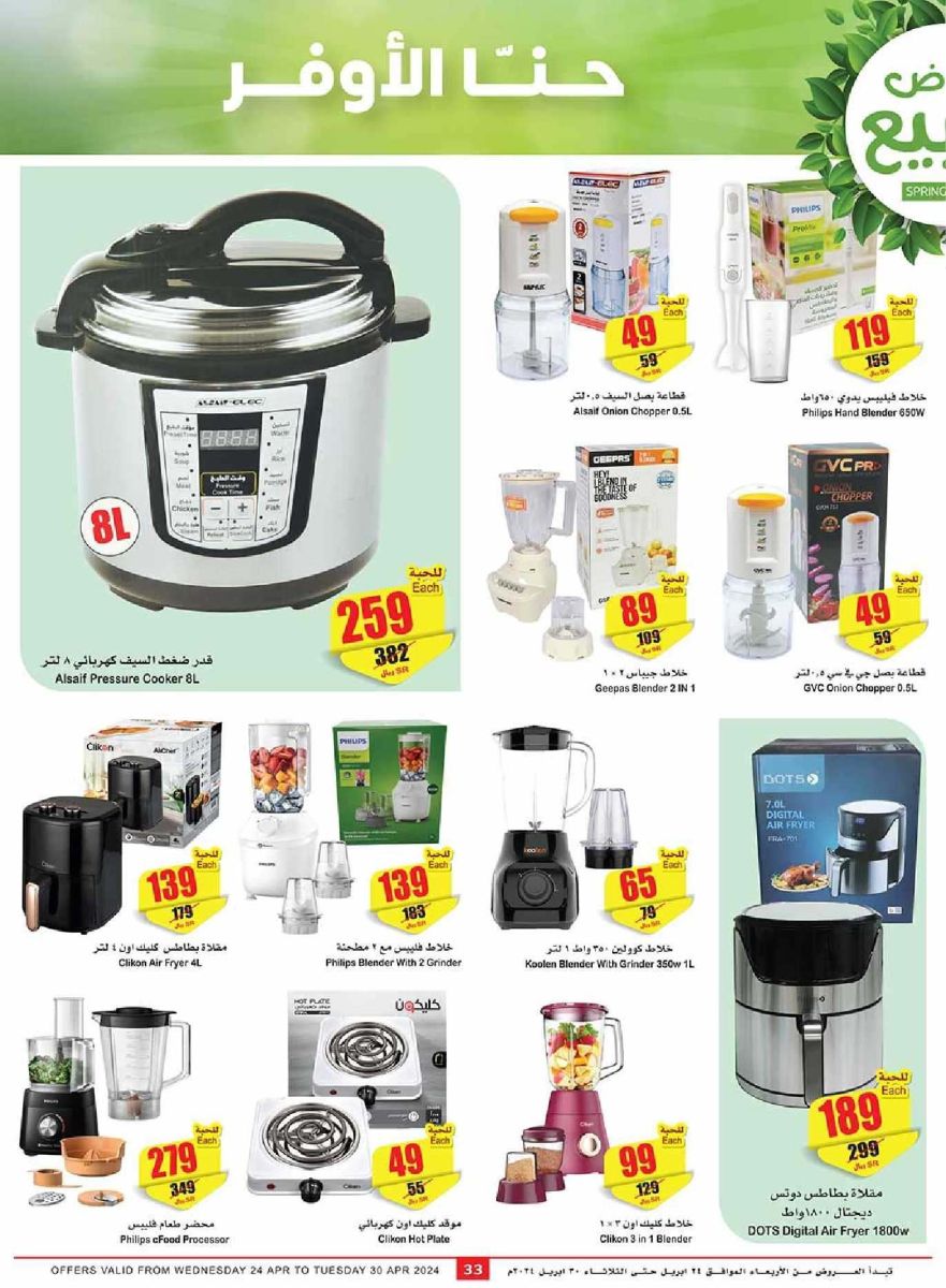 من ضمن العروض البارزة في فروع العثيم، يمكن للزبائن الاستفادة من أسعار لا تقبل المنافسة على الخلاط اليدوي من فيليبس بقوة 150 واط، والذي يعد إضافة قيمة لأي مطبخ بفضل سهولة استخدامه وكفاءته في استهلاك الطاقة، كما تتوفر خلاطات تقليدية من العلامة التجارية جيباس بأسعار مخفضة كذلك.