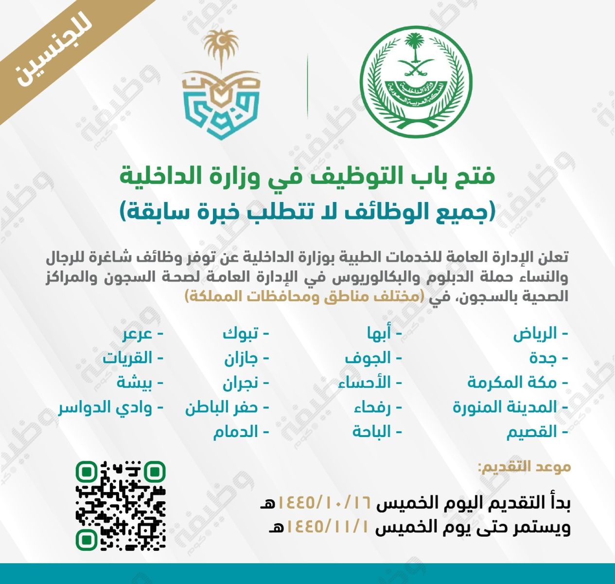 أصدرت الإدارة العامة للخدمات الطبية التابعة لوزارة الداخلية بيان بشأن توفير فرص عمل شاغرة، مفيدة بأنه لا يطلب من المتقدمين الحصول على خبرة مسبقة لشغلها.