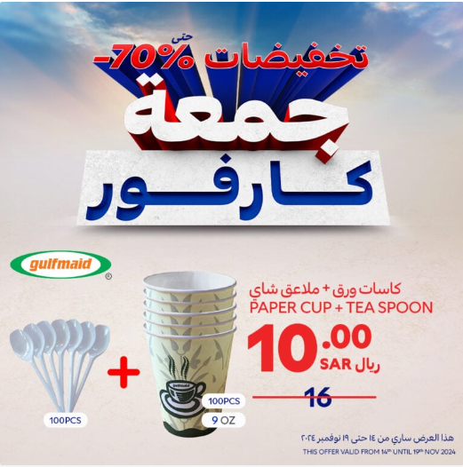 - مجموعة كاسات ورقية وملاعق شاي (100 قطعة لكل منها): الآن بسعر 10 ريالات فقط بدلاً من 16 ريال.