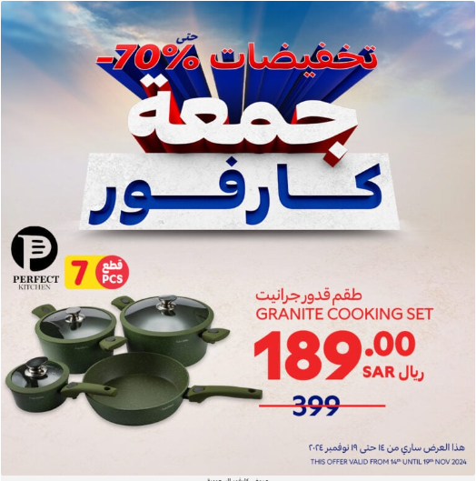 - طقم قدور جرانيت (7 قطع): بسعر 189 ريال فقط بدلاً من 399 ريال، مما يوفر خصمًا كبيرًا للعملاء.