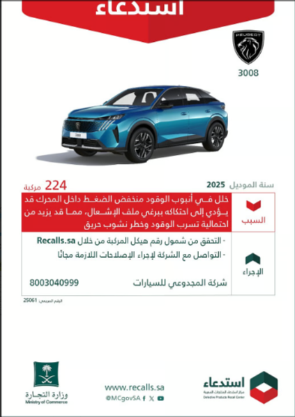 في إطار سعيها المتواصل لحماية المستهلك وضمان سلامته، أعلنت وزارة التجارة في المملكة العربية السعودية عن استدعاء عدد كبير من مركبات "بيجو 3008" موديل 2025.