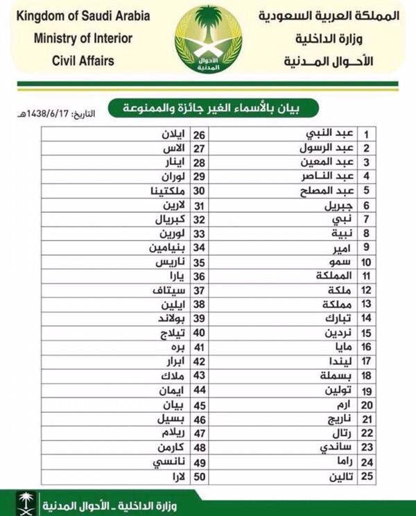 السعودية تعلن منع استخدام أسماء جديدة للمواليد الذكور والاناث للمواطنين والمقيمين